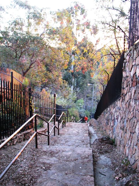 Westcliff was built more than a hundred years ago across the Witwatersrand Ridge, which runs east to west through Johannesburg. This means it’s very hilly. There is a network of stone stairways connecting the streets – Joe uses these stairs for his daily exercise. We climbed up and down several flights, sharing them with the joggers as the sun began to go down.
