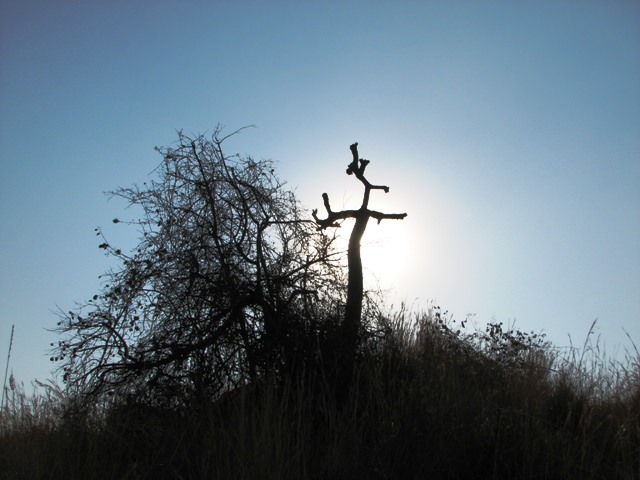 It was near 2:00 – the sun got hotter and the wind picked up. We were hungry but not sure where to stop. Suddenly an oasis appeared ahead – a dirt clearing surrounded by a low stone wall and a circle of trees. It was an old kraal – an enclosure where the farmers kept their livestock.
