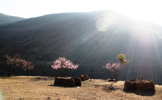We took the paved road out of Mokhotlong and drove for about 40 minutes until we reached the town of Mapholaneng. Joe took pictures through the windshield as the sun rose against the mountains. It’s the dry season; the mountains are uniformly brown except for scattered explosions of pink where the cherry trees are in full bloom.