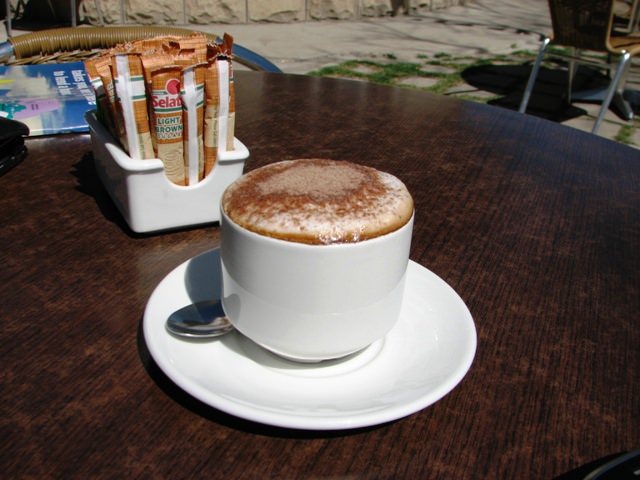 We were late the next morning so we ate trail mix. No time to sample the breakfast fare at the nameless guesthouse. But before leaving town we did have a nice lunch and drinkable coffee (i.e., not Nescafé) at the Ouh La La Café, a thatched-hut coffee shop in the center of town. Cappuccino for me, americano for Joe (this took some explaining but they got it right), and a ham and cheese crepe for each of us. We dined al fresco and watched the traffic go by.