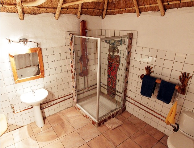 Andrew is what he calls a wood butcher. Each Antbear room is filled with the most exquisite woodwork I’ve ever seen – furniture, window frames, lamps, door hinges, and waste baskets. I marveled at every detail in the sitting room and bedroom, and when I entered the bathroom I nearly gasped. There was a glassed-in shower with a life-size mosaic of an African woman inside, and a Jacuzzi tub big enough for a family of four. Even the toilet paper dispenser was a work of art.