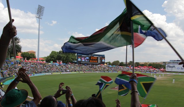 We pulled into SuperSport Park in Pretoria at 9:00 a.m. Joe headed to the sidelines to set up his equipment and I went to the box office and purchased a grandstand ticket for R50. Seven U.S. dollars to watch the two top cricket teams in the world.