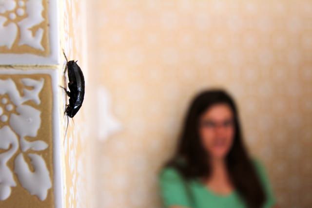 This cockroach has been hanging out in our bathroom since last night. I won’t be showering until he departs. Photo courtesy of Joe: I’m too scared to get close enough to take a good pic.Joe convinced me to stand in the shower to provide context. It was against my better judgement but I did it for the sake of the blog.
