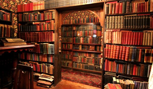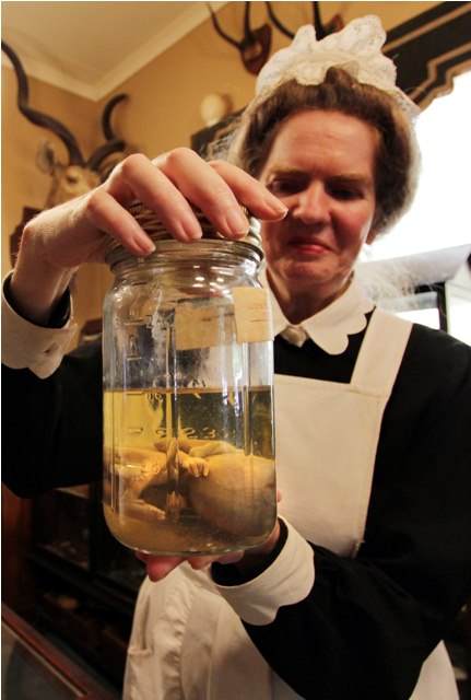 Katharine shows us the dining room and explains the intricacies involved in a formal Victorian dinner. The most interesting tidbit I learned: When a Victorian lady went out to dinner, it was considered inappropriate for her to use the hostess’ chamber pot or to go to the outdoor toilet. So if she had to go to the bathroom, she would say she felt faint and call for her carriage to take her home. Men, on the other hand, were welcome to use the chamber pot or go outside. (Photo courtesy of Joe.)This is not the real dining room; it’s the dining room in Katharine’s doll house. The dollhouse is mind-boggling.The Lindfield House library. The library was the man’s domain. Women were not allowed in unless invited, although men would sometimes ask their wives and daughters to sit with them in the library. Books inappropriate for female eyes were put out of reach on the top shelves.Lindfield House has a small nature room, which Victorian children of the house would have used for studying science. It’s filled with curious objects like exotic shells, skeletons, and pieces of taxidermy. It also includes this human foetus preserved in formaldehyde. Seriously!This stunning walnut bed is the central feature of the main bedroom. Katharine sleeps here.The bed in one of the smaller bedrooms has a pull-out step to make it easier to climb into. The bottom step doubles as a chamber pot. Brilliant.Oscar the Cat.Mom and I love afternoon tea – it’s one of our favorite things to do together on vacation. The Lindfield tea was spectacular – mini sausage and meat pastries, fluffy scones with jam and cream, and some scrumptious cakey-custardy things. The tea itself was also delicious but I unfortunately forgot to ask what kind it was. We did our best to eat everything, but failed. Lucky enjoyed the leftovers. (Photo courtesy of Joe.)