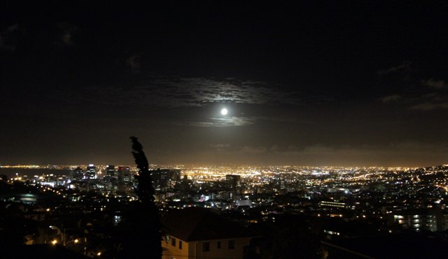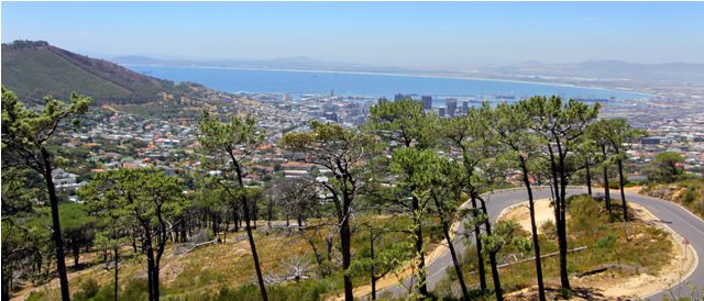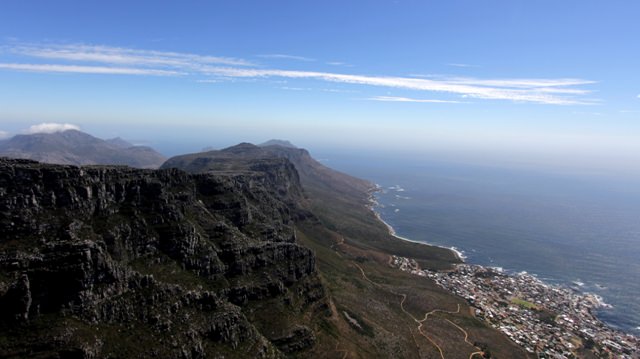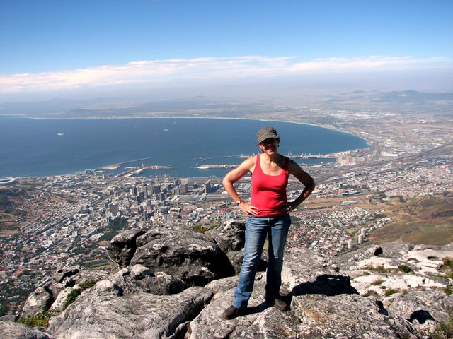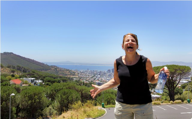 We looked out the window. The mountain was right there. We looked at the map and saw we could walk straight up Kloofnek Road for a couple of kilometers to the cableway. Mom and I are always looking for a good workout. So we smeared on some sunscreen and started up the road on foot.