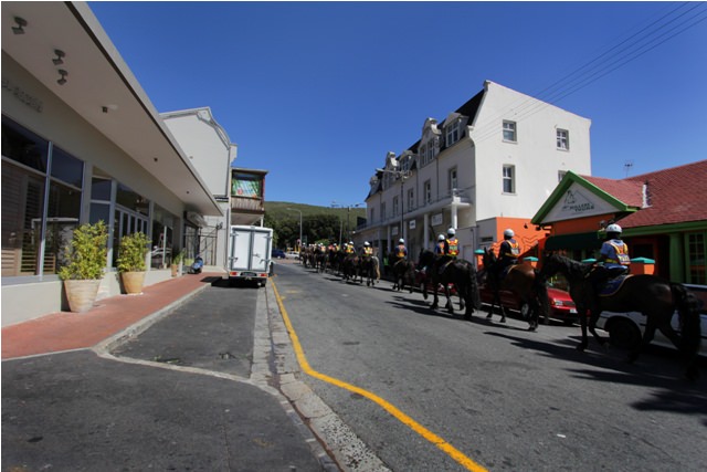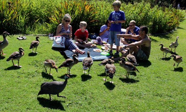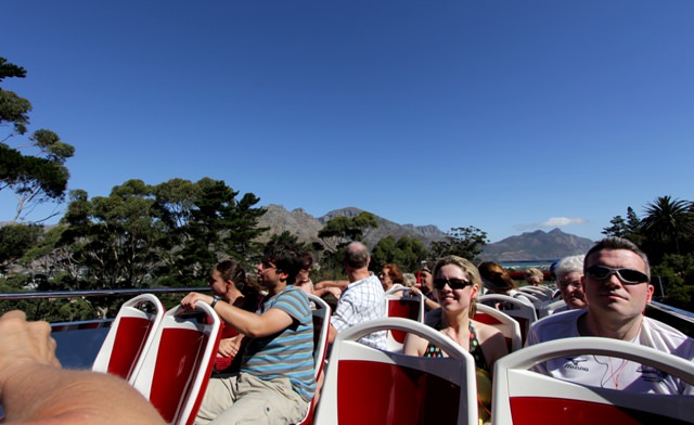 Riding the Hop On Hop Off Cape Town Sightseeing Bus. For someone who thought she disliked group tours, I certainly did a lot of them last weekend. We wanted to visit Kirstenbosch National Botanical Garden and the bus was the easiest way to get there. Tickets cost R120 per person and we had the option of stopping at several other locations around town. We also learned many interesting things about Cape Town by listening to those nifty red earphones.Kirstenbosch National Botanical Garden, the largest botanical garden in the country with the biggest collection of indigenous flora. It’s a beautiful place for hiking (you can actually walk up Table Mountain from there), picnicking, or just sitting and gazing at the view. You can also have a delicious lunch at the Tea Garden.Looking through the branches of a gigantic fig tree in the garden’s arboretum. It reminded me of [Wonderboom](/2010/09/18/wonderboom/ "Wonderboom!").A family of Egyptian geese closes in on a human family picnicking at Kirstenbosch. The guinea fowl in the foreground, who walked with a limp but still got around quite well, seemed to have adopted the goose family.The city tour bus stopped at Camp’s Bay, a super-trendy Cape Town suburb. Mom and I spontaneously decided to hop off and have a drink. We sat at a seafood restaurant called Ocean Blue, watched the world go by, walked up and down the street, and then took the next bus back to town.A typical Victorian house in Tamboerskloof, which is a great place to stay on a short visit to Cape Town. You go straight down the hill to get to the Waterfront and straight up the hill to get to Table Mountain. Walking around Tamboerskloof is tiring though – there are no flats.Shrimp curry (foreground) and peri peri shrimp (background) at Beleza, a Portuguese/Italian restaurant on Kloof Nek Road in Tamboerskloof. We had one dinner and one breakfast there – both were excellent and the restaurant had an interesting alternative vibe.Mounted police ride past Miller’s Thumb, where we had our best dinner in Cape Town (see [previous post](/2011/01/30/daytripping-around-the-cape/ "Daytripping Around the Cape")). Also in Tamboerskloof.