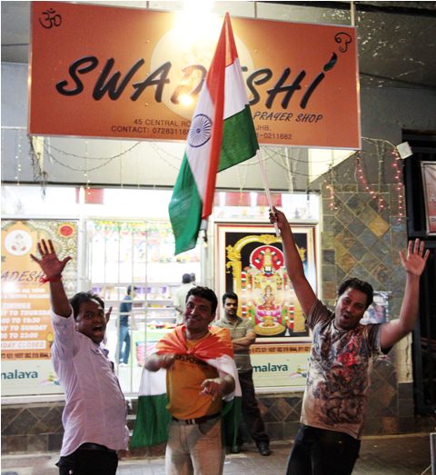 We decided to drive home. We turned a corner and out of nowhere, we were engulfed by flashing lights, horns, and people chanting and cheering. A caravan of vehicles was driving the slowly the other way – bakkies (pickup trucks) with dozens of people piled on top, sedans with small children hanging out the windows, and young men draped in Indian flags running in and out among the cars. They even had a police escort.