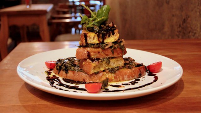 I had the Spanish vegetarian breakfast – delicately spiced scrambled eggs topped with haloumi, onions, and red peppers, with a side of grilled ciabatta bread and berry-chili jam. Joe ordered the “Leaning Tower of Odd.” I copied the description straight from the menu so I wouldn’t forget: