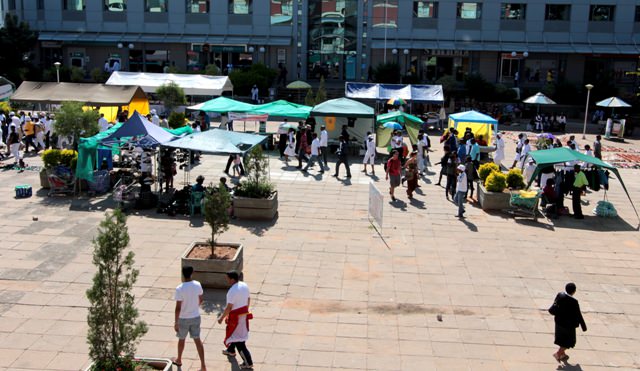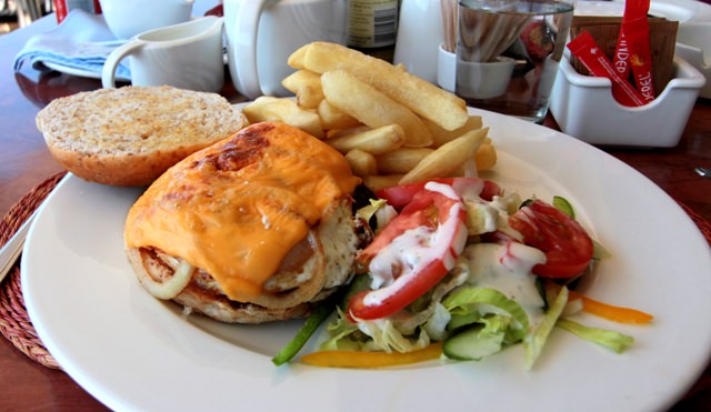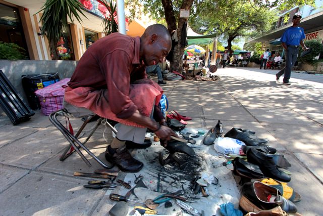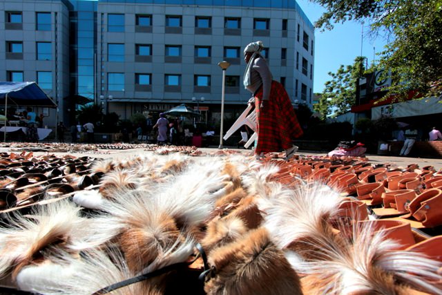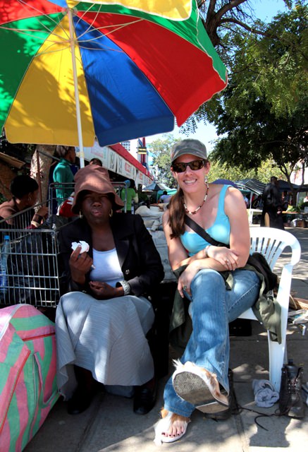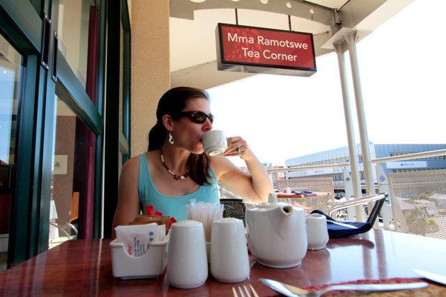 It’s hard to see, but this is the set of the No. 1 Ladies’ Detective Agency television series. The set is protected by armed security guards and photos aren’t allowed.Mma Ramotswe likes to have tea on the terrace of the President Hotel (now called the Cresta President Hotel, which you can barely read on that sun-baked sign). The hotel looks like a Motel 6 and the terrace is smaller and more metallic than I imagined. I was charmed nonetheless.I drank tea in Mma Ramostwe’s Tea Corner! Bush tea, of course. (Photo courtesy of Joe.)View of the Gabs downtown mall from the hotel terrace.In addition to bush tea, I decided to order a big, fat cheeseburger. Topped with fried onions, fried tomato, and a fried egg. It was surprisingly divine – the best burger I’ve had in Africa. (Even better than [Spur](/2011/04/23/the-spur-burger-a-south-african-texan-native-american-tradition/ "The Spur Burger: A South-African-Texan-Native-American Tradition").) Now I understand how Mma Ramotswe became a "traditionally built" woman.After lunch, we checked out the stalls and vendors along the downtown mall. I wanted to buy a pair of furry shoes (made from springbok fur) to wear as bedroom slippers. But they were asking too much and, like all the other vendors I encountered here, refused to negotiate with me. The shoes were fun to try on though. (Photo courtesy of Joe.)I bought two lovely pairs of earrings from this stall, for 15 pula (just over $2) each. I think Mma Ramotswe would approve of my choices.The vendors on the mall cater to locals as well as tourists. I know that Mma Ramotswe hates buying new shoes, so she probably hires this guy to repair her shoes when they wear out.