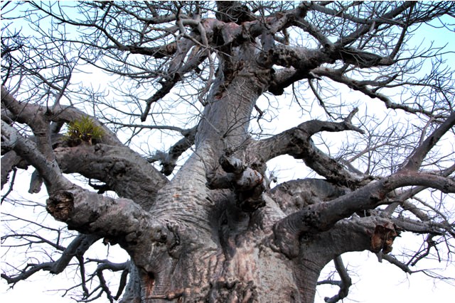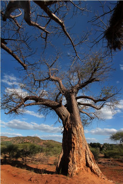 Baobab wood is spongy, which means it holds a lot of water. It’s hard to judge the actual size of baobabs because they shrink during times of drought. Elephants strip the bark off baobabs to get the moisture, and also to consume the fibre in the bark. People weave the bark fibre into cord to make rope and clothing.