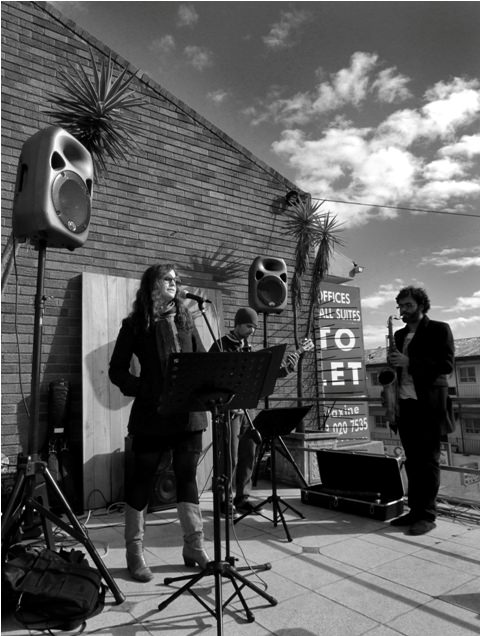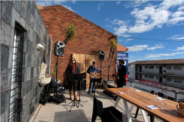 Today I attended a “Jazz Breakfast” fundraiser on the roof of a vacant building in Melville, to raise money for an upcoming poetry festival at the Melville Visitors Centre. The weather was splendid, the view was sensational, the conversation was pleasant, and the music was lovely. It was a perfectly enjoyable – and blog-able – morning. I had a blast taking photos.