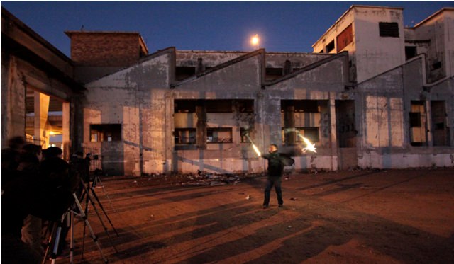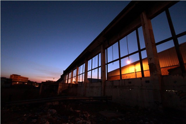 We gathered at sunset in the parking lot of the Sci-Bono centre in Newtown. The group headed across an empty field and under the M1 highway, to an industrial area filled with crumbling warehouses and garbage.