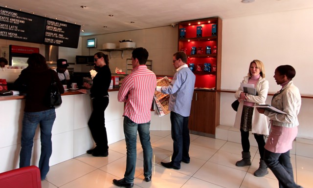 Motherland Coffee, in the sparkly new Zone 2 shopping centre in Rosebank, shares Bean There’s African fair trade philosophy and is also wildly popular among coffee-drinking hipsters and business types. I see a national chain in the making. The atmosphere reminds me of Caribou Coffee, Starbucks’ toughest competition in the U.S.
