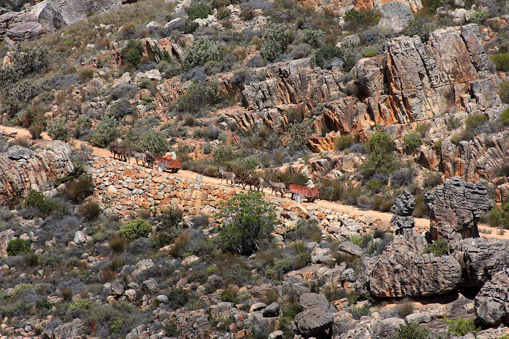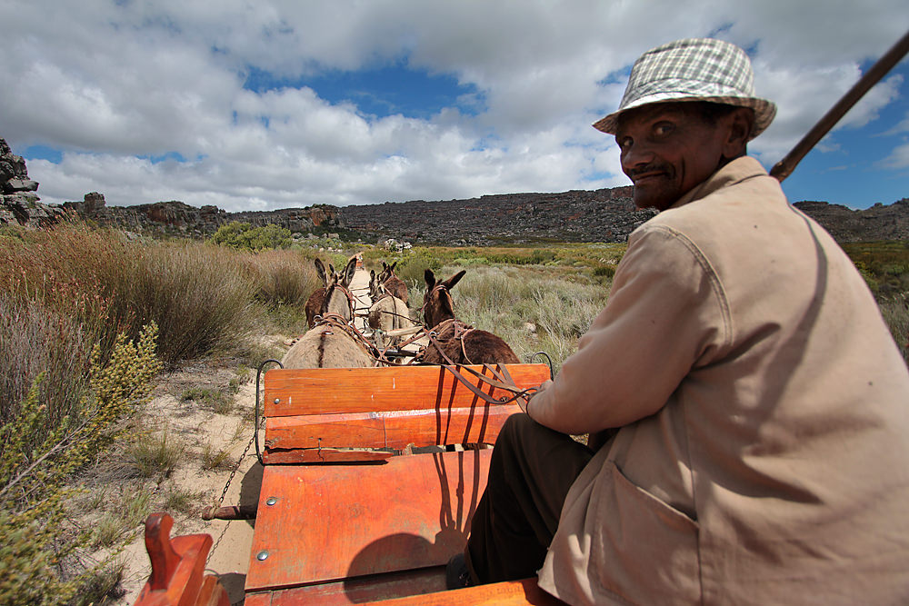 This is the part of the trip I looked forward to the most. We would travel 12 kilometers from the top of Pakhuis Pass to the village of Heuningvlei, riding/walking with donkey carts – the traditional mode of transport for people living in the Cederberg. We arrived at the top of the pass and met Devon and Johannes, the donkey cart drivers. They loaded our luggage onto the carts and motioned for us to climb aboard.