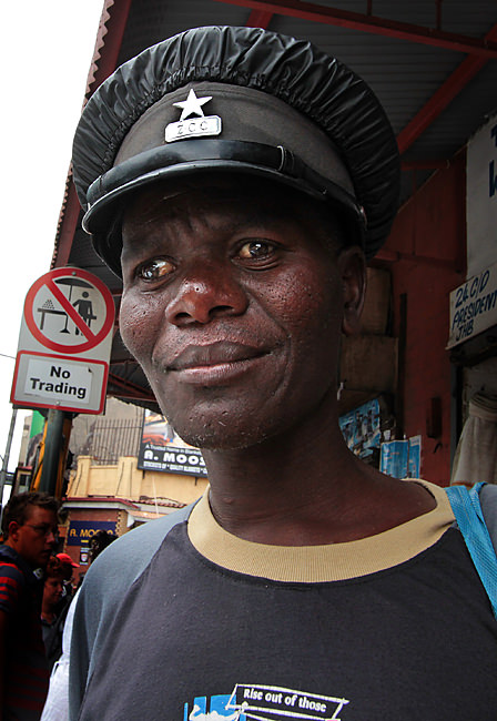 A nice man who wanted me to photograph him in his Zionist Christian Church cap. I love the “No Trading” sign behind him. Yeah, right.