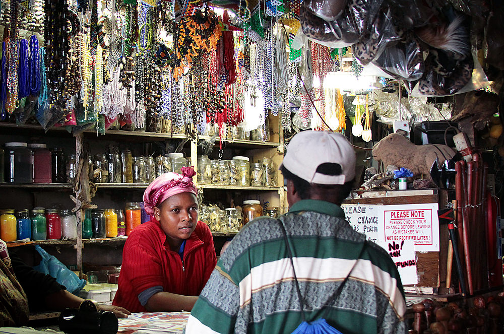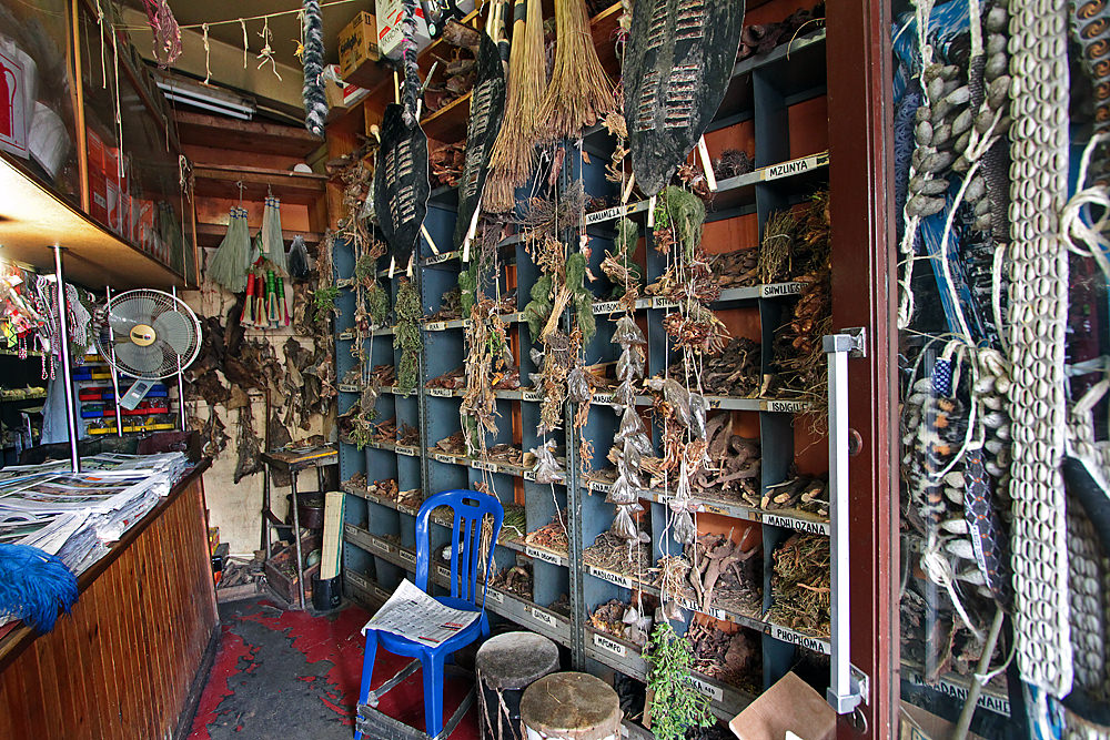 The shops in this area are frequented by sangomas – or traditional healers – who go there to buy herbs, beads, clothing, and other materials necessary for their profession.