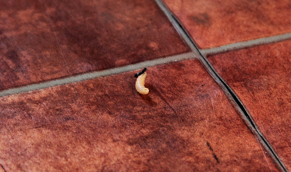 Behold: the maggot. The sesame seed on the floor next to him gives an indication of his size. That black thing is a piece of dirt stuck to his face.