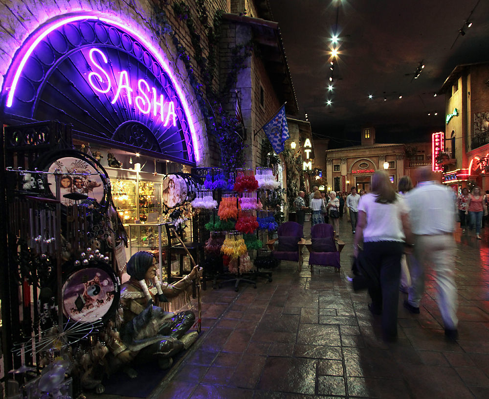 The strange reflections above the “buildings” are the only tip-off that this “street” is indoors.