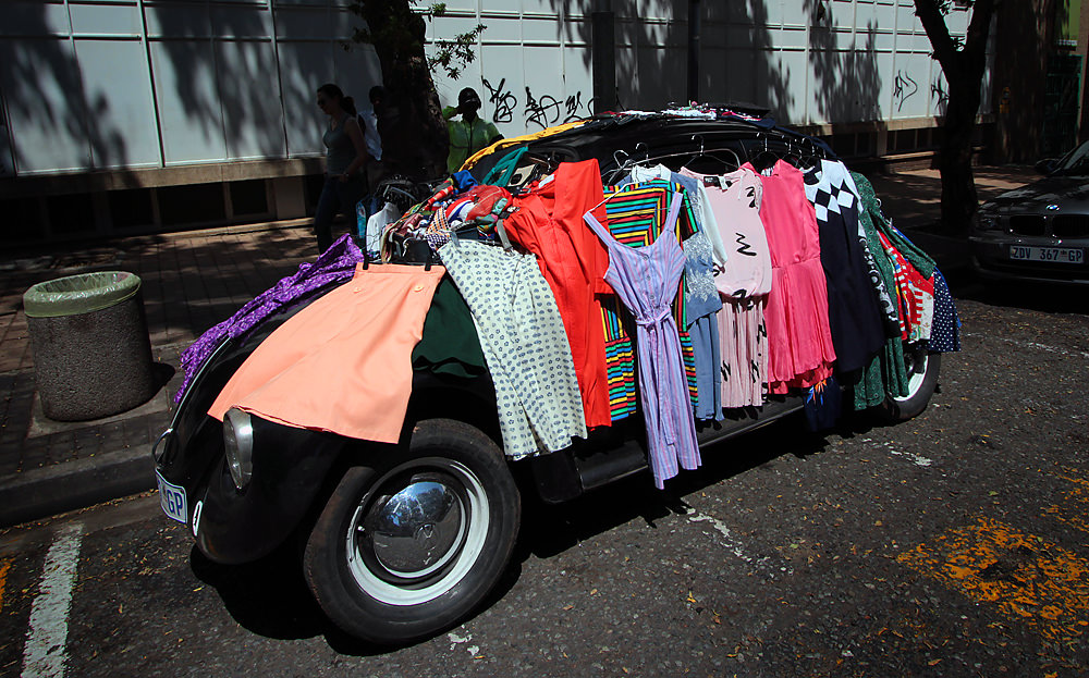 My friend Michelle was in town today on a nine-hour layover, and I took her on a whirlwind sight-seeing tour of Joburg. On our way to the Neighbourgoods Market in Braamfontein we came across a Volkswagen Beetle parked on Juta Street. The car was covered in vintage clothes.