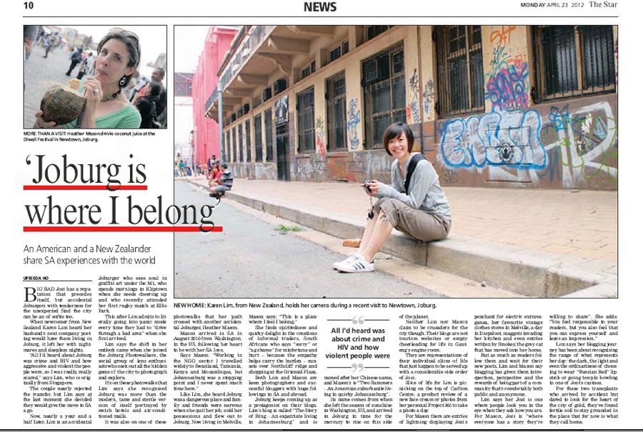 This article is really cool for several reasons. First and foremost, seeing my photo in the newspaper is cool. (It also happens to be the last photo that Jon ever took of me.) Reading the headline of the article – Joburg is where I belong – and realizing that I actually said those words, is cool.
