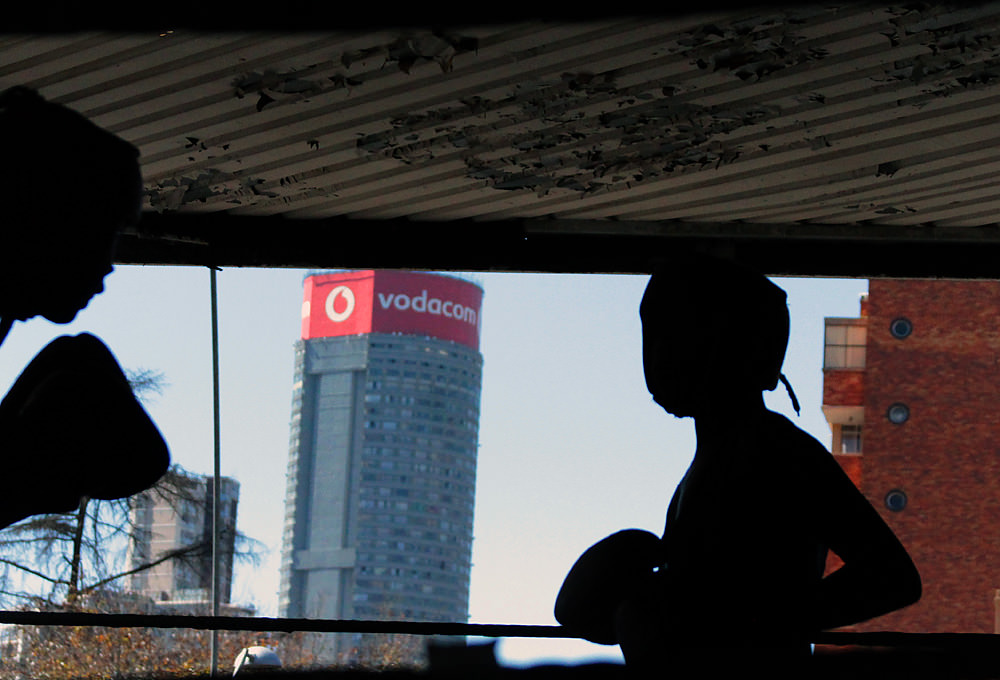 Spectators line up along the fence outside the gym, with the Hillbrow Tower looming behind.