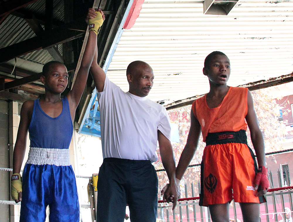Pep talk. This boy, whose name is Thabang, ultimately won his fight.