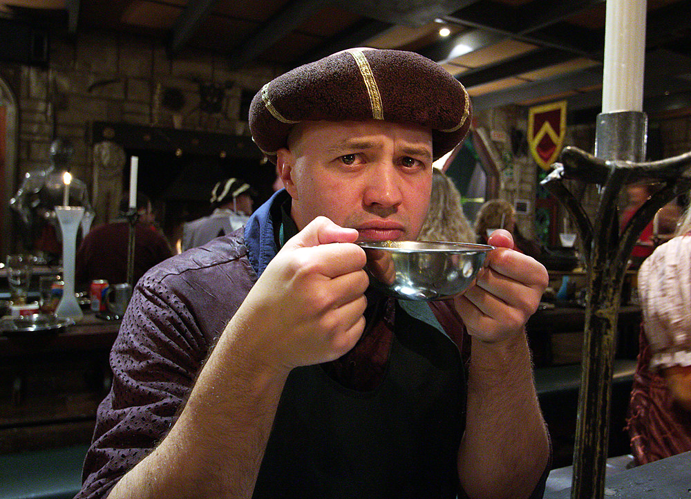 The Baron informed us of several rules. First, there was to be no clapping. We were to display our approval by banging our wooden mallets upon the table. Second, the Baron reminded us that we had traveled back to an era before women’s liberation, when ladies existed solely to please their lords. If a lord at the table required salt for his food (a necessity because the food was on the bland side), a lady at the table must get up and go to the table of the Archbishop, curtsy, and say, “Please sire, I require salt for my squire.” The Archbishop would then bequeath thee a pinch of salt. I think I was the only lady at my table who actually did this.