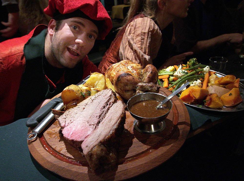 We were introduced to our entertainer, a man named “the Baron” who did bawdy medieval schtick and forced members of the audience to engage in a myriad of embarrassing behaviors. The Baron was funny, albeit a bit too loquacious in my opinion. By the end of the evening I had had quite enough of him.