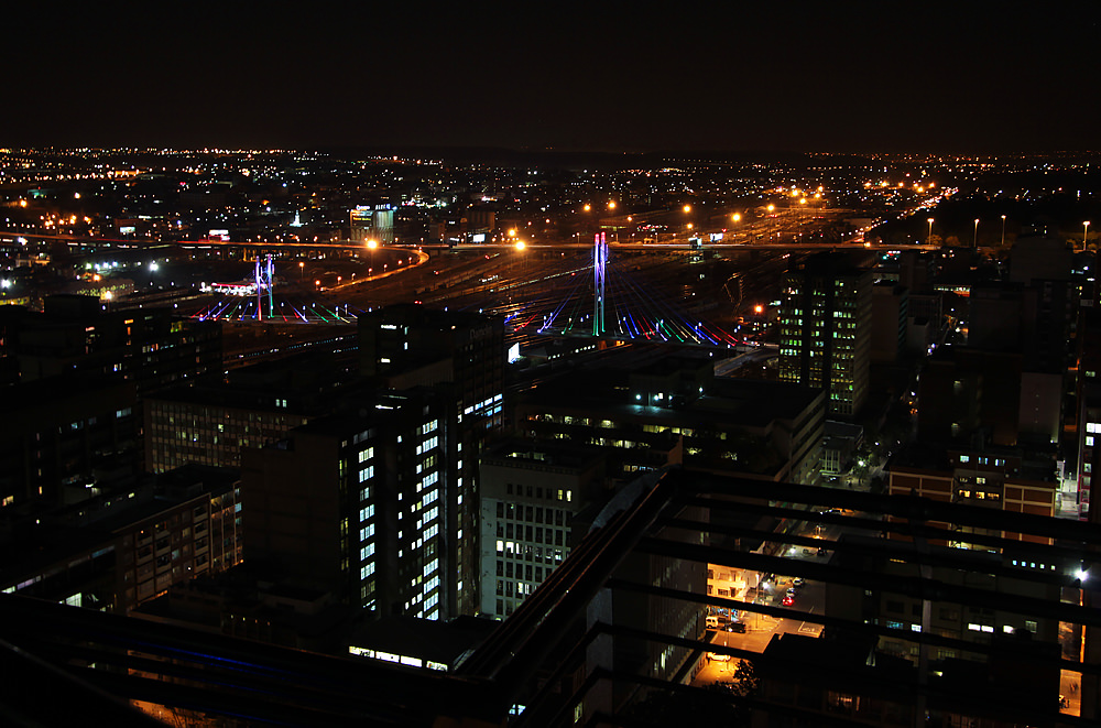 Nelson Mandela Bridge was sporting its multi-colored weekend look that night.