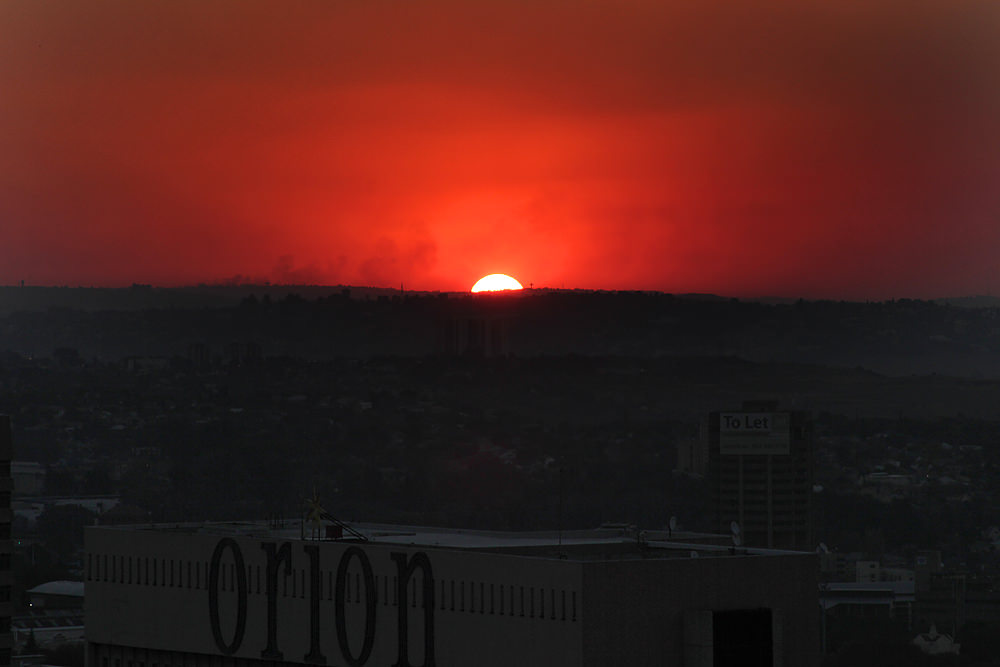 View of the east side: The Telkom Tower surrounded by the highrises of Hillbrow. Along the skyline is a layer of pollution, caused mostly by woodsmoke – a classic sign of winter in Johannesburg.