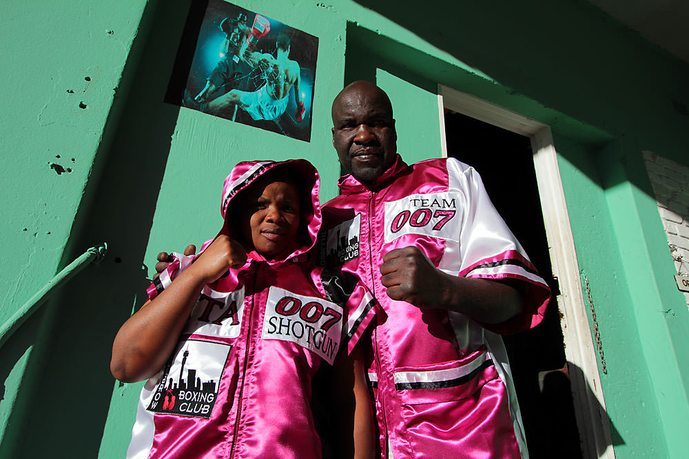 Rita Mrwebi and her coach, George Khosi, model their new “kit”. George has been training Rita since she was nine years old. She is now the South African women’s welterweight boxing champion.