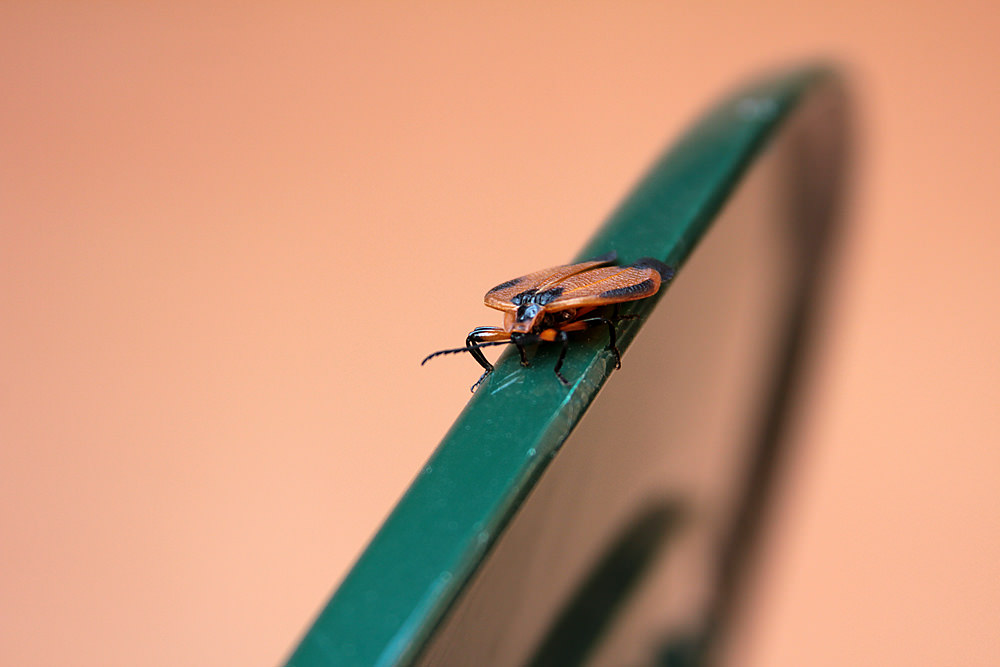One of my favorite places to shoot pictures is, literally, in my own backyard. There are so many interesting plants, birds, and insects in Joburg and I don’t have to go far to find them. This interesting beetle, which I nicknamed a beetherfly but is actually called lycus Trabeatus, perched on my green plastic deck chair last summer and allowed me to have a nice long photo session. I love how the orange color of the beetle, and of the wall of my house, contrast with the green chair.