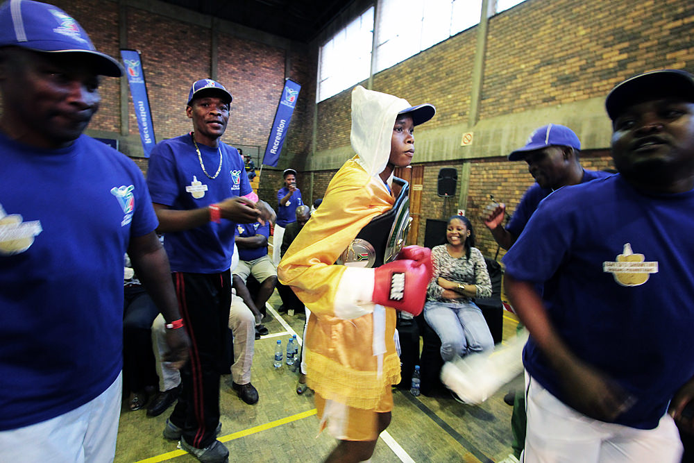 The first of the two title fights was between Gabisile Tshabalala, the current South African junior featherweight champion, and her challenger, Nomvelo Mgcaba. When Gabisile came dancing into the ring to a tune by Zahara, with an entourage of trainers dancing around her, I knew this would be interesting. The crowd in the gym had suddenly swelled. It was loud.