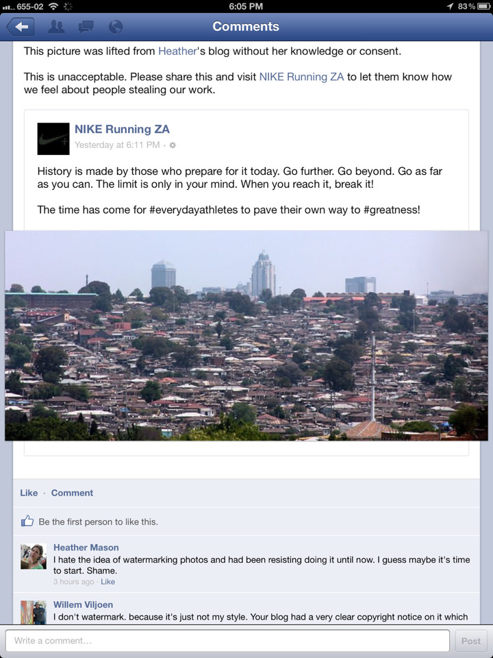 UPDATE: This morning I received a call from the brand communications manager for Nike South Africa. He apologized profusely for the misuse of my photo and agreed to compensate me for the photo’s usage. Of course this doesn’t undo the damage completely, but I’m pleased that Nike owned up to the mistake and offered to resolve the situation in a reasonable way. Nike, you have regained a little bit of your coolness now, at least in my eyes.