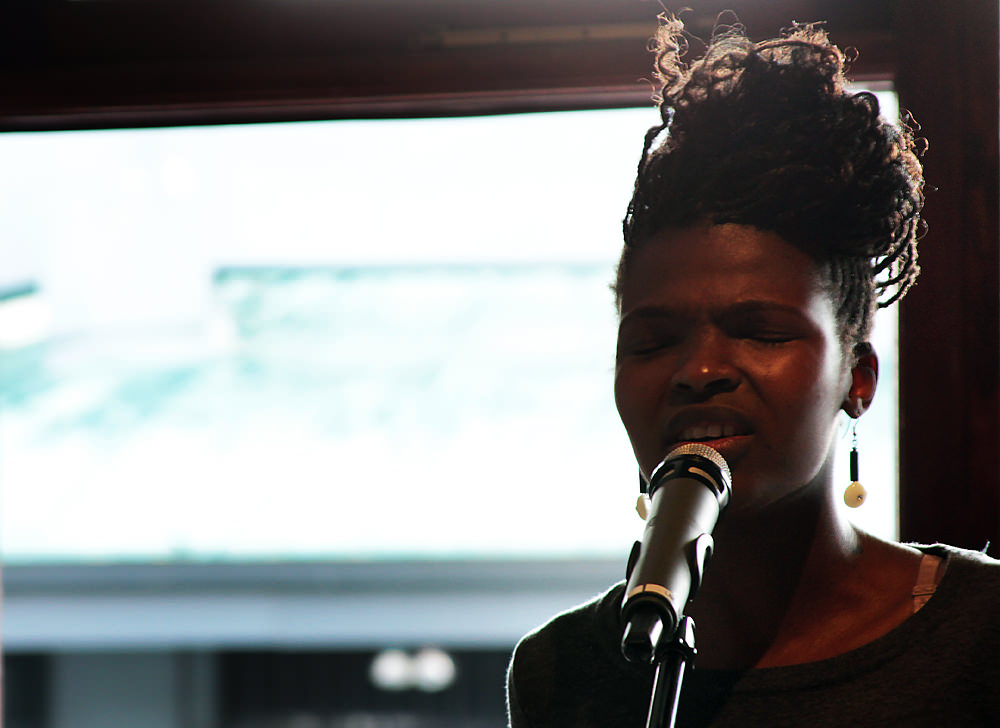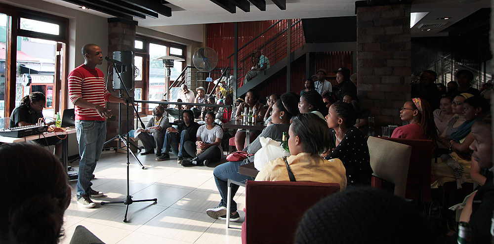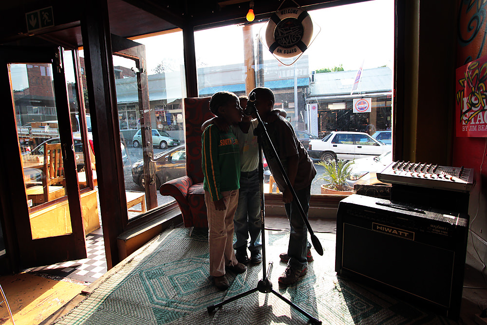 Young South African poets of the future take advantage of an open mic at The Loft. They are giving a rousing rendition of Nkosi Sikelel’ iAfrika.