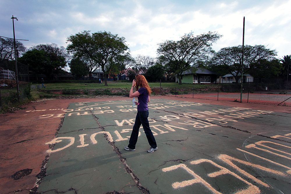 An abandoned tennis court in Faan Smit Park became a larger-than-life poem by Hennie Meyer, written in birdseed. Ruth, who speaks Dutch, does her best to translate it from Afrikaans for me.