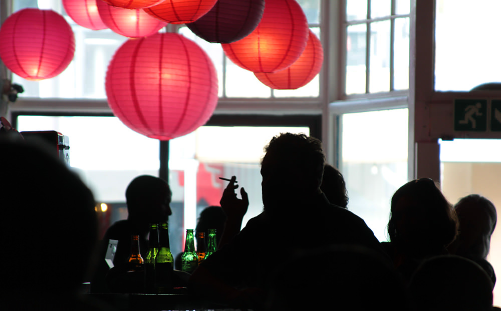 Listening to live music and poetry at a bar called TranSky.
