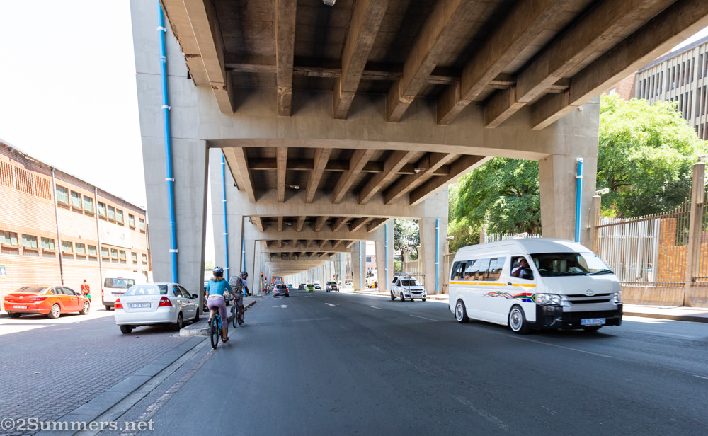 My favorite part of the tour was cycling for a long stretch down Henry Nxumalo Street, which runs directly under the M1 Highway. It was cool and shady under the highway as we peddled slightly downhill. I loved watching the cement bridge stretch out above me, narrowing to a point in the distance.