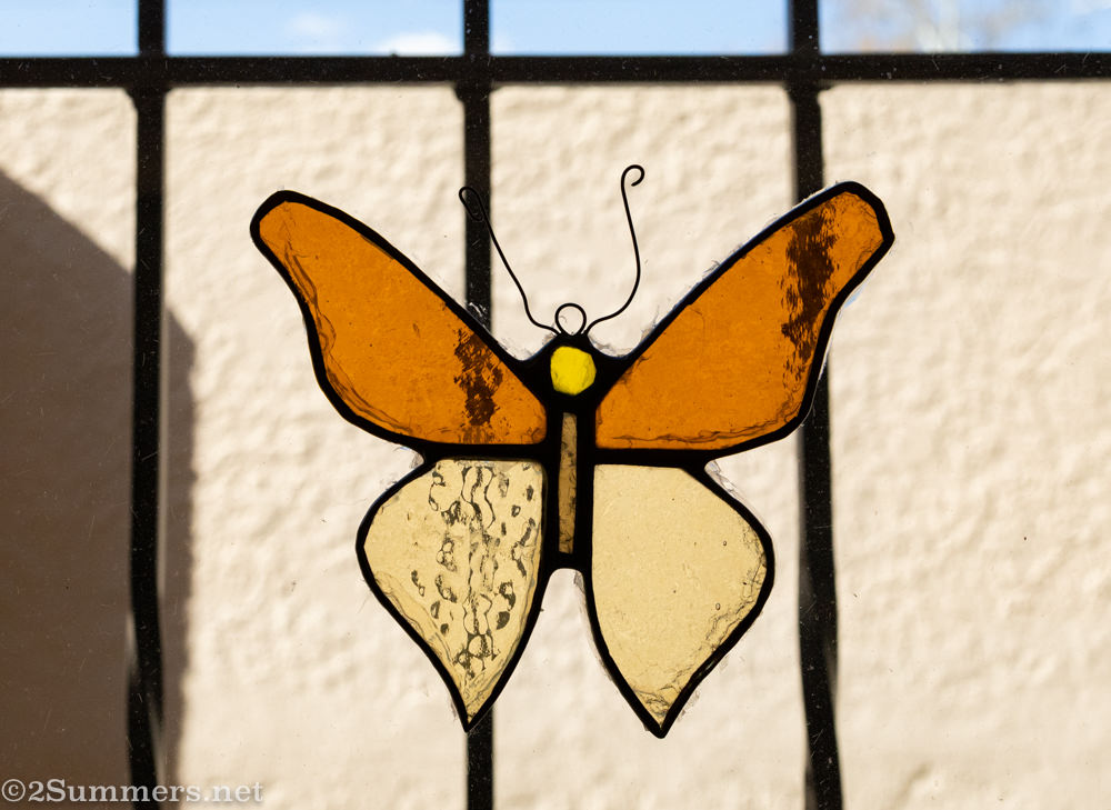 The photo at the top of this post shows one of three lovely stained glass butterflies on the window above my sink. I think my landlady Carol put them there, and I can’t believe I’ve never photographed them before as they’re so pretty. The butterfly reminded me of this excellent podcast I listened to yesterday about the migration of monarch butterflies.