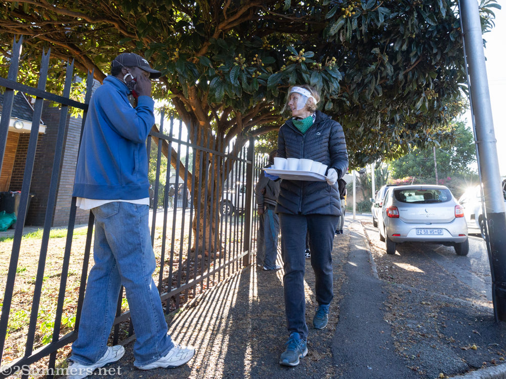 All of the compliments I gave to the volunteers above also apply to the people who came to pick up their parcels. Every single person at the church today was respectful and kind. Everyone wore a mask (when they weren’t drinking coffee). Everyone socially distanced. Everyone sanitized. Everyone was patient and helpful.