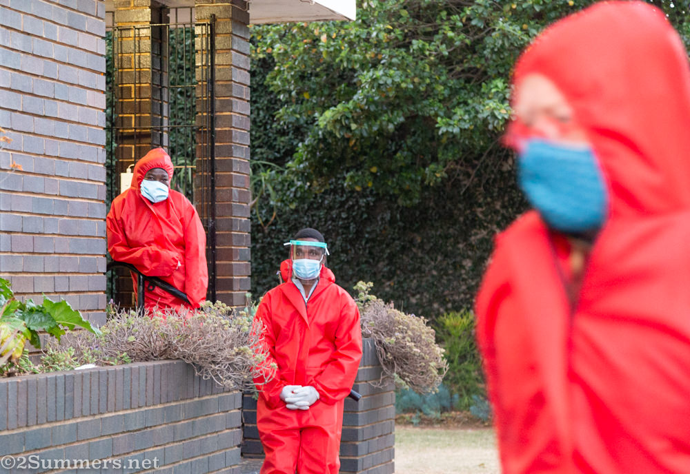 It was both dystopian and funny watching everyone walk around in these suits, complemented by masks, face shields, and rubber gloves. Like, this is the actual world we are living in now? I kept waiting for Dustin Hoffman to walk around the corner with a camera crew.