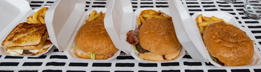 We walked back to Thorsten’s office, where the architects all work, and laid out the Dagwoods. We discovered the main difference between the regular Dagwood and the Jumbo Dagwood is the regular one is on toast and the jumbo one is on a larger, round roll. I’m pretty sure all four sandwiches were otherwise the same.