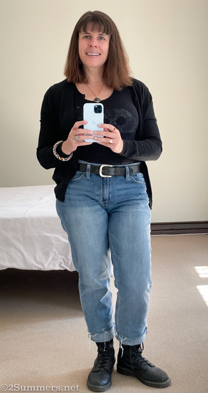 I’ll leave you with a photo of myself, taken with my phone in the mirror earlier this afternoon, wearing a new pair of jeans I recently bought in America and an old pair of Doc Martens I recently found in the back of my closet.