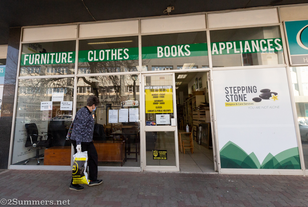 We started in Alberton at the Stepping Stone Hospice Charity Shop, which sells donated clothes, furniture, books, and everything else you can imagine. Most of the clothing items sell for R100 ($7) or less, and many things are priced at R5 ($.35). All the profits from Stepping Stone go to support their hospice center in Alberton.