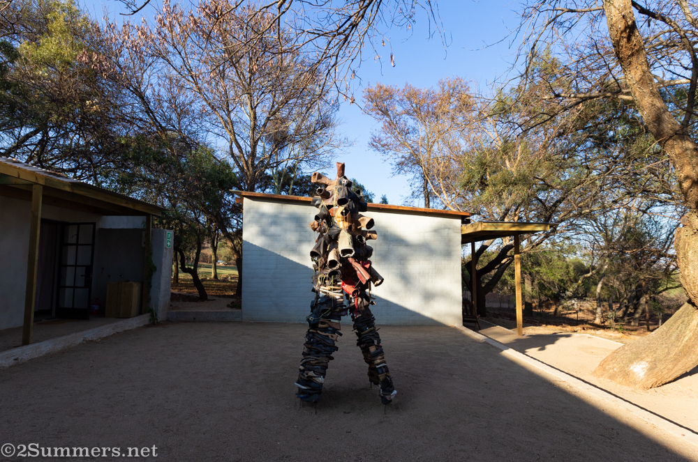 My room at the Farmhouse, designed in a style called wabi-sabi.In keeping with the modern sculpture theme at Nirox, which is across the road, there are several interesting works of art on the Farmhouse grounds. This striking sculpture, made with discarded shoes, is by Zimbabwean artist Tawanda Takura.The current dining space at the Farmhouse, which is lovely and all outdoors. (There are is larger restaurant currently under construction behind this one.)