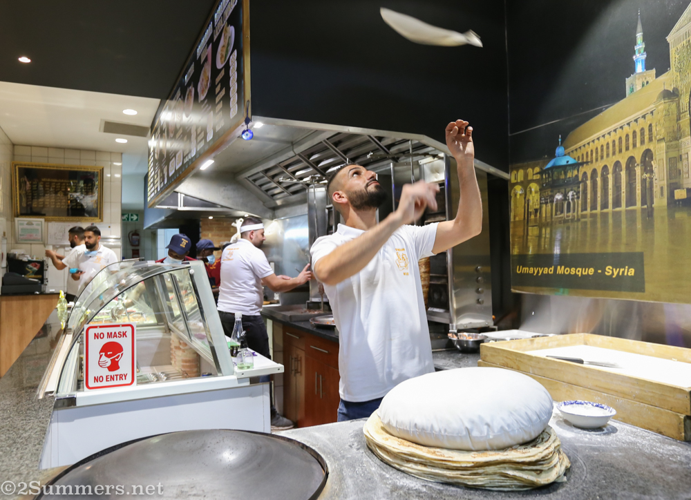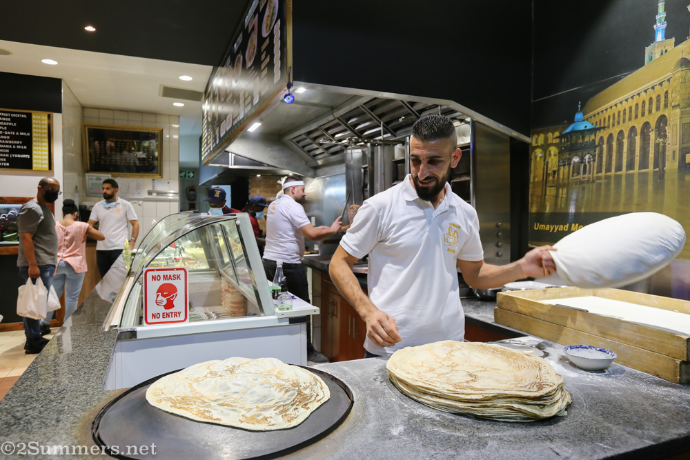 After dinner I took some photos of Deaa, the guy making laffa bread at the front of the restaurant, and the other staff. It’s fascinating to watch Deaa: He stretches the dough over a white cotton pillow, tosses the dough into the air, then slides it onto a dome-shaped burner for a few seconds until it starts to bubble and brown.