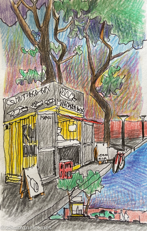 Thorsten and I had no idea what to expect as we journeyed to the East Rand last Friday evening. I had nothing to go on beyond Debjeet’s very brief description, Mustardbox’s relatively new Instagram page, and a Google Maps location. But we couldn’t have been more delighted when we arrived. Mustardbox is a tiny little container parked at the back of a huge shopping center (wow, there are a lot of huge shopping centers in Boksburg), in between a row of apartment complexes and a row of fast food drive-throughs. The container is surrounded by cheerful branding and the location is oddly pleasant, with plenty of parking, a picnic table with an umbrella, and a few nice trees.