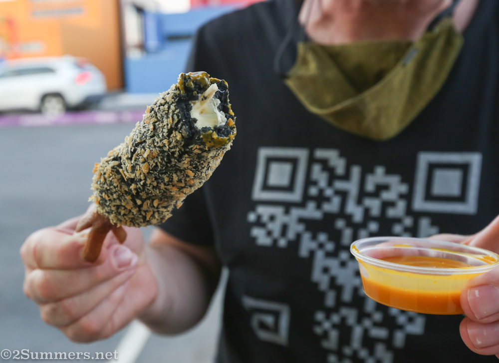 The squid dog requires a little more explanation. Let me start by saying there is no actual squid in this corn dog, although I think in Korea they put squid ink in the batter. Jason uses activated charcoal to turn the batter black. The inside of the corn dog is half mozzarella, half sausage, and the sausage sticks out of the bottom – carved into the shape of squid tentacles. (For some context, watch this YouTube video.)