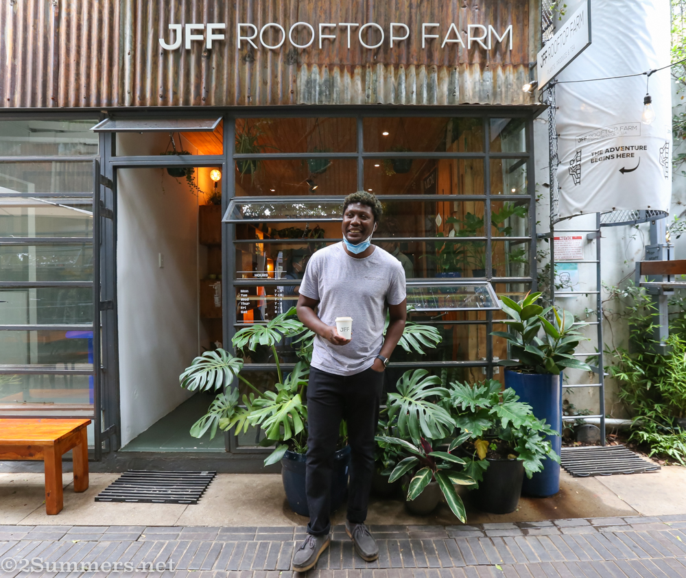 JFF Rooftop Farm was founded by Ashleigh Machete, a third-generation farmer from Soweto (JFF stands for Jozi Food Farmer), and his partner Negin Monkoe, who was hard at work behind the espresso machine on the day we visited. The farm has been in Braamfontein for a few years and originally started as a herb-supplier for a local restaurant. The farm seems to sell mostly decorative plants now, although there are also some food-bearing plants for sale.
