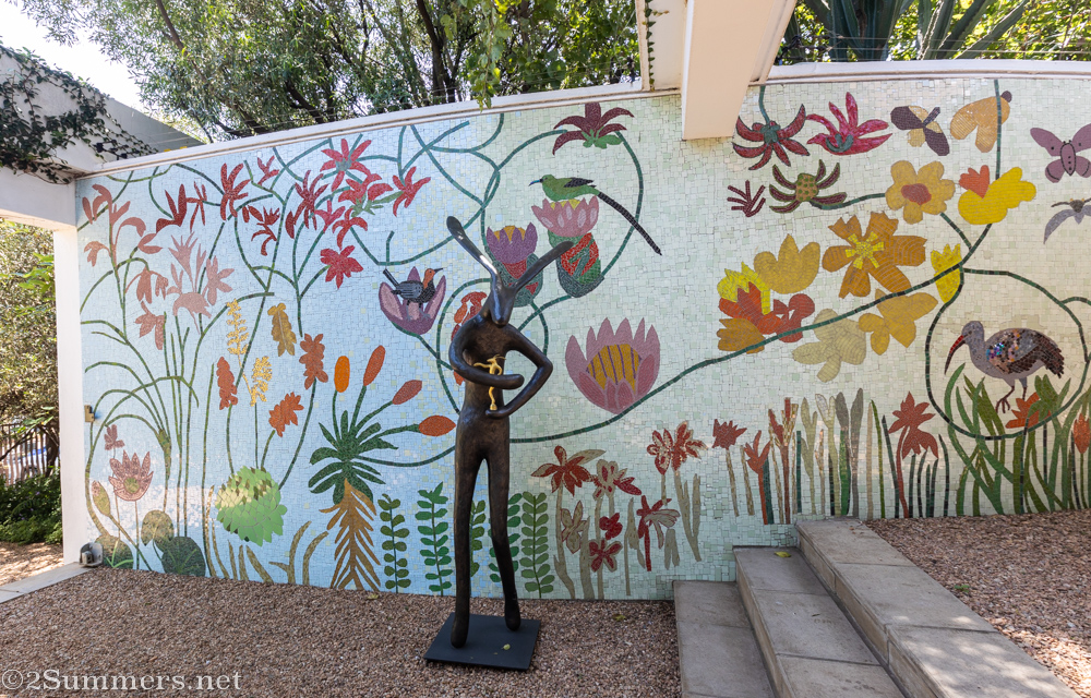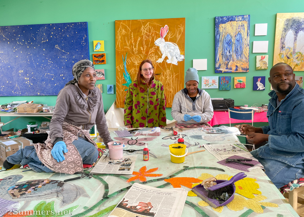 The mosaic was designed by artist and Brixtonite Bronwen Findlay and executed by Bronwen and her team: Alex Shabalala, Sindiswa Moyo, Gavaza Mthombeni, Mosa Mosikidi, and Simba Mgeda. I was fortunate to see the mural in progress a couple of times last year when Thorsten and I brought two tour groups to Bronwen’s studio.